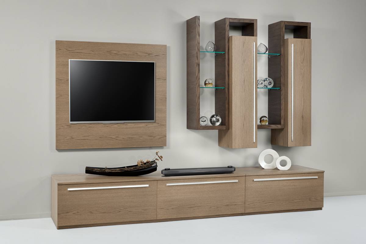 Σύνθεση τηλεόρασης σχέδιο Magic από φυσικό ξύλο δρυς σε μοντέρνα γραμμή. Κρεμαστά ντουλάπια με πορτάκια, κρυστάλλινα ράφια και πλάτη πίσω από την τηλεόραση.